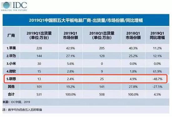 根据IDC公布的2019第一季度中国平板电脑厂商出货量数据显示,联想平板电脑出货量暴跌48.7%,排在第五名,市场占有率为2.4%。