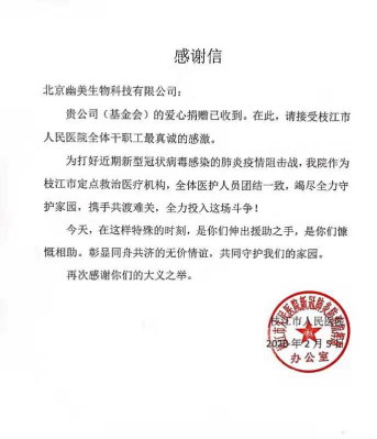 此外,北京幽美于近日向重庆市新型冠状病毒肺炎疫情防控工作领导小组捐赠防护服500件,用于支持重庆市的疫情防控工作。