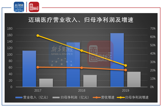 图2:2017-2019年迈瑞医疗营业收入、归母净利润及增速