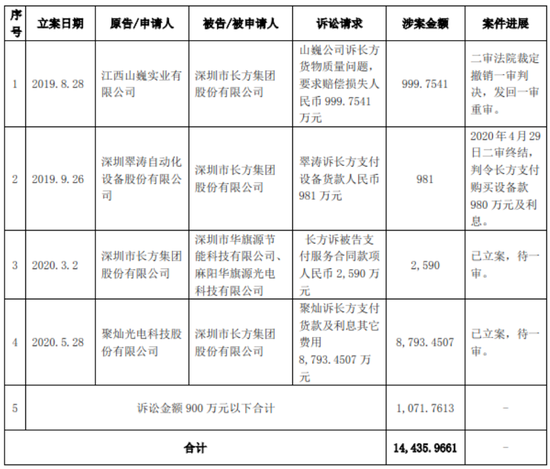 发布出售资产公告当日,长方集团还发布一份诉讼公告。因公司与聚灿光电的货款纠纷,聚灿光电向深圳市中级人民法院提起诉讼,立案日期为2020年5月28日。
