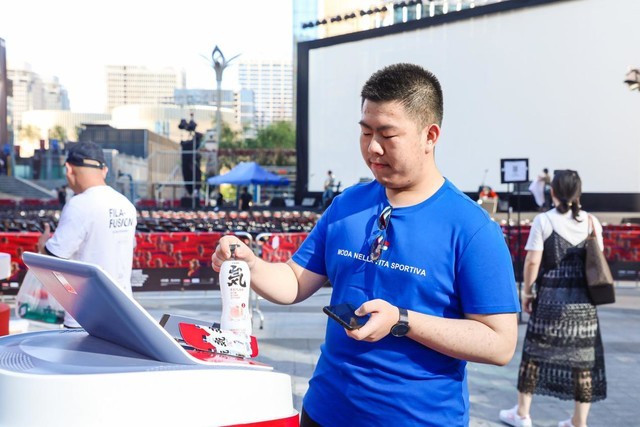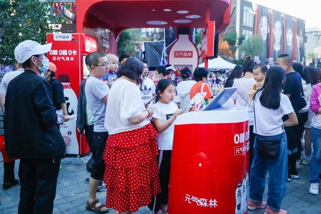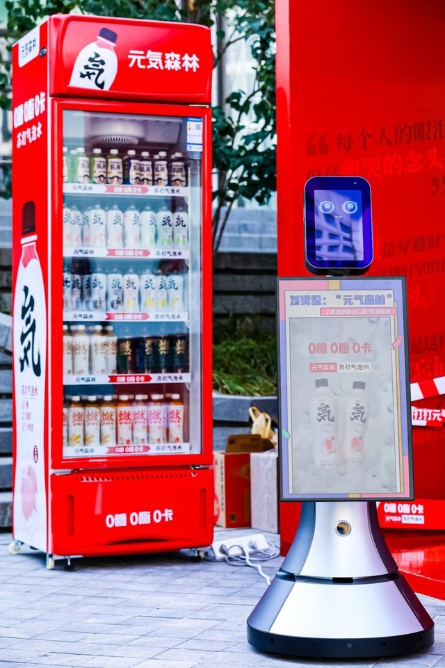 再看会行走的自动贩卖机“豹小贩”,通过主动出击,吸引影展现场的影迷们来买元气森林的货。影迷们对它说出自己喜欢的元气森林饮品,确认选择后它就会从仓体里托出饮品,递到你面前,服务十分到位。