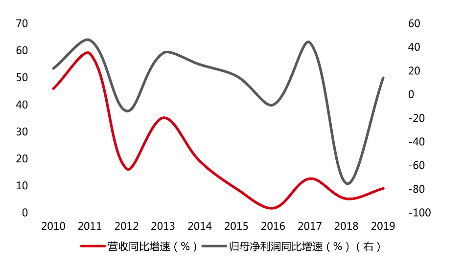 潮宏基2010年—2019年营收及归母净利润同比增速