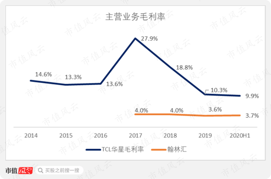 华星毛利率的迅速下挫使得公司整体毛利率相对应下滑,2019年降至11.5%,较2017年几近腰斩。
