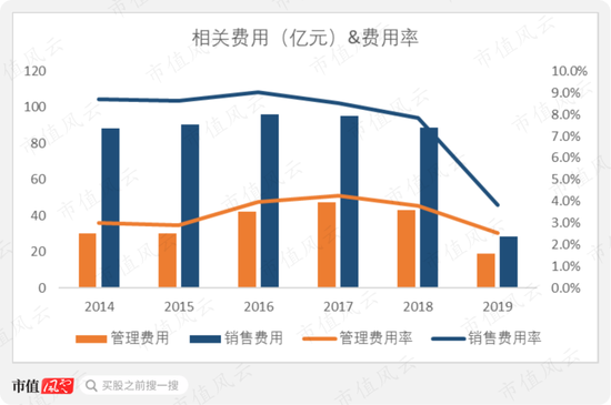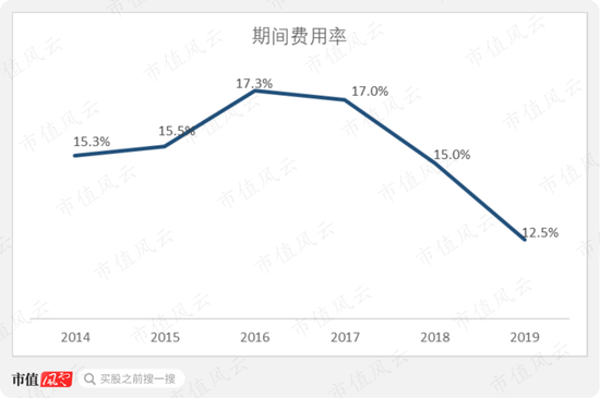有趣的是,公司的整体毛利率在和净利率出现了趋势上的背离。在整体毛利率严重下滑的情况下,净利率却不降反升,2019年升至4.9%。这要归功于公司对于期间费用的控制能力提升。