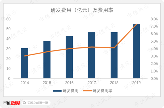 实际上,2019年,公司研发费用率由上年的4.1%大幅升至7.3%,研发费用总额达54.6亿元。