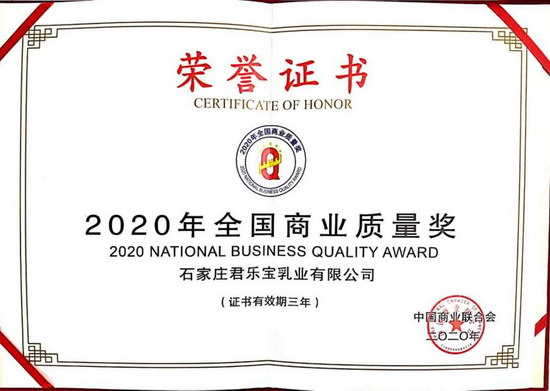 11月1日,2020年全国商业科技质量大会在京召开,大会主题为“科技创新助力实体经济、诚信兴商铸就质量体系”。君乐宝乳业集团凭借多年来创新驱动、诚信赋能的高质量发展新貌获“2020年全国商业质量奖”。