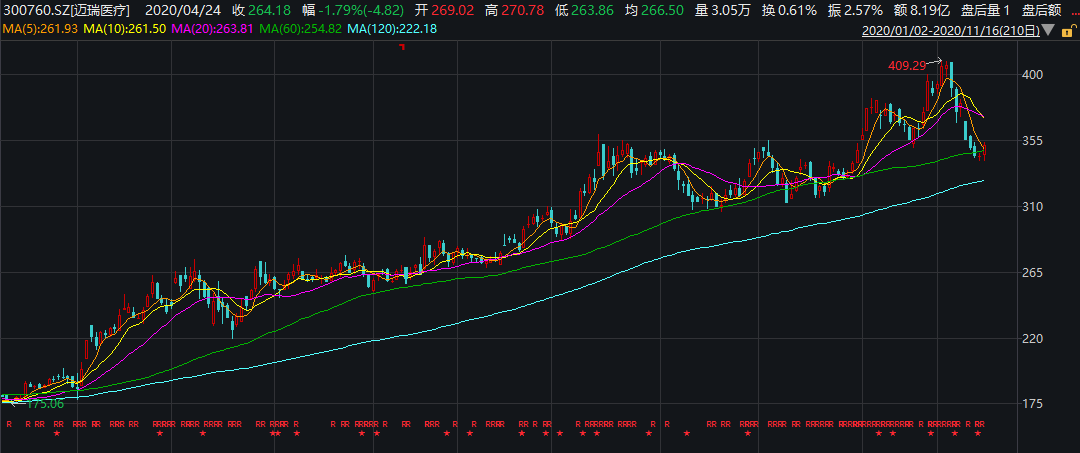 截至11月16日收盘,迈瑞医疗报351.34元/股,最新总市值4271亿元。