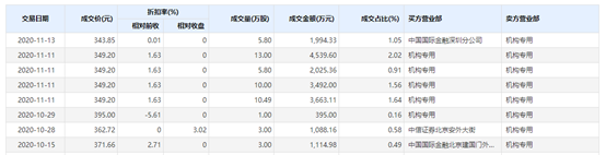 近期,迈瑞医疗连续出现机构卖出的大宗交易。例如,11月11日,该股出现4笔大宗交易,分别卖出13万股、5.8万股、10万股、10.49万股,而卖方营业部均是机构专用,累计成交金额达1.37亿元。有市场人士猜测,这些机构卖出股票的大宗交易或是公募基金所为。