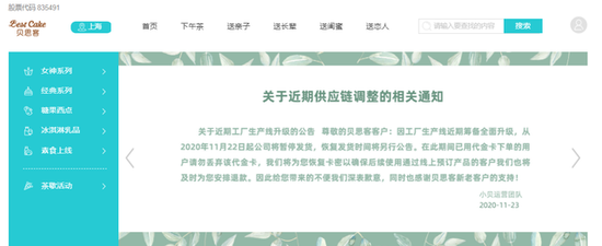 新京报记者注意到,贝思客官网目前显示的14个运营城市中,上海、苏州、南京地区于2020年11月23日发布了调整供应链的通知,称工厂生产线近期筹备升级,从11月22日起暂停发货,恢复发货时间另行公告;北京、天津、嘉兴、常州等地自2019年9月26日起调整服务,消费者仅能通过官方提供的二维码订购少数几款蛋糕;而重庆、成都两地已因疫情影响暂停城市相关业务。