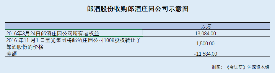 但据市场监督管理局数据,2016年3月24日,郎酒庄园公司修改了所有者权益,由12,351.81万元变更为13,084万元。即2016年11月,宝光集团将郎酒庄园公司100%股权转让予郎酒股份的价格较之上述数据少了11,584万元。