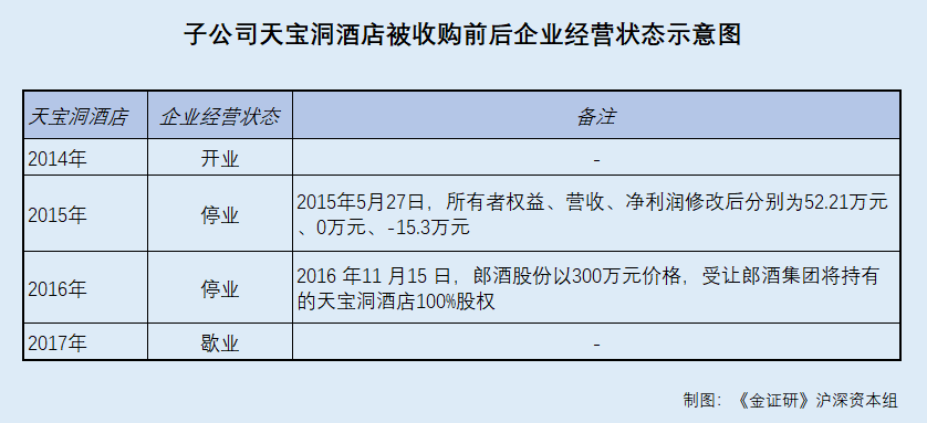 据市场监督管理局数据,2015年,郎酒股份子公司天宝洞酒店的企业经营状态为“停业”。2016-2017年,其企业经营状态分别为“停业”、“歇业”。