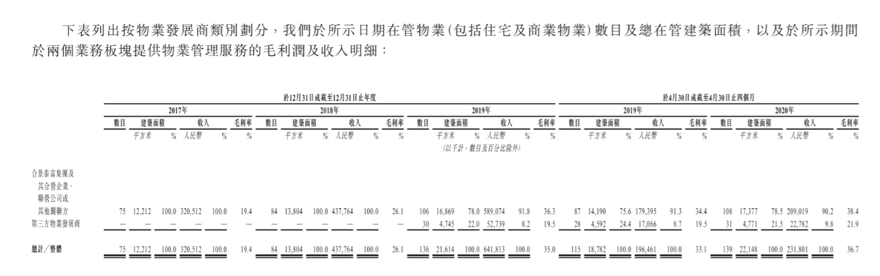 合景悠活招股书显示,2017-2019年间,来自合景泰富方面的物管项目的毛利率分别为19.4%、26.1%、36.3%,截至2020年4月,这一指标达到了38.4%。