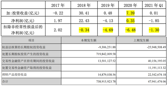 其次从净利状况来看,公司2020年披露的净利润是3500万,但公司2020年盈利的原因在于其7.39亿的投资收益,就是说,公司扣非后净利润仍然处于亏损,而且呈现扩大的趋势,甚至一季度仍在亏损: