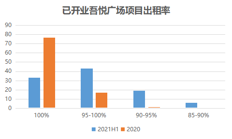 不过出租率方面,吾悦广场在业内处于较优水平,租金有稳定保障。截至2021年上半年,平均出租率为97%,相比2020年的96%略有上升,处于行业前列。如将出租率划分区间,出租率90%以上项目占比超95%,其中出租率100%项目33个。