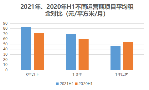 以租金/建筑面积/时间计算项目平均租金可以发现,开业运营3年以上成熟期项目平均租金较高,约82.67元/平方米/月,1-3年及尚在培育期的1年以内项目,平均租金分别为69.98元/平方米/月、46.25元/平方米/月。