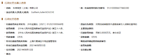8月13日讯,12日,国家企业信用信息公示系统发布的一则行政处罚信息(沪市监黄处〔2021〕012021000668号)显示,科蒂商贸(上海)有限公司因对商品或者服务作虚假或者引人误解的宣传被罚款3万元并责令改正。