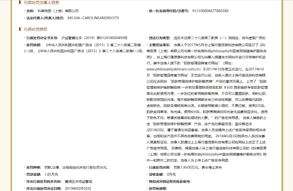 值得注意的是,此前该公司便因发布虚假广告被罚款1.85万元。