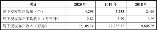 2018年-2020年,汉仪股份线下授权客户数量分别为2463个、3233个和4298个,线下授权客户平均收入分别为3.93万元、3.79万元和2.82万元,线下授权客户收入合计金额分别为9645.95万元、1.23亿元和1.21亿元。由此不难看出,在客户数量大幅增加的情况下,线下授权客户的平均收入则在持续下滑,尤其2020年,线下授权客户的总收入和平均收入都有所下滑。