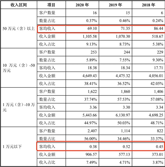 尤其需要关注的是汉仪股份1万元以下的客户。2018年-2020年,该层次客户的数量分别达到822个、1114个和2407个,三年期间增加了1585个客户,仅2020年一年就增加了1293个,但是2020年的客均收入却由之前的0.52万元减少至0.38万元。