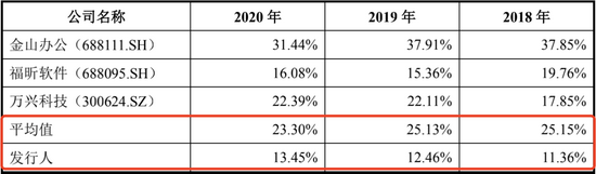 招股书披露,汉仪股份的研发内容主要包括设计研发和技术研发两类。2018年-2020年,汉仪股份的研发费用分别为1937.60万元、2641.92万元和2655.93万元,研发费用占营业收入的比例分别为11.36%、12.46%和13.45%。而同为软件和信息技术服务行业的金山办公、福昕软件和万兴科技被汉仪股份列为同行业公司,这三家同行公司的研发费用率平均值分别为25.15%、25.13%和23.30%,汉仪股份的研发费用率远低于同行公司的平均水平。