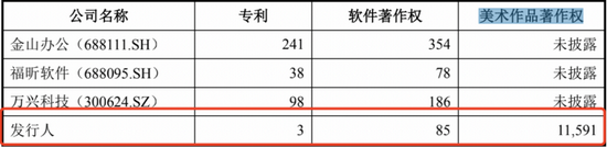 此外,和同行金山办公、万兴科技以及福昕软件相比,汉仪股份的专利数量远远不敌同行,而这或许与其主营“字体”的业务有关,汉仪股份的研发成果主要集中在美术作品著作权方面,共有11591项,而软件著作权有85项,专利仅仅只有3项。