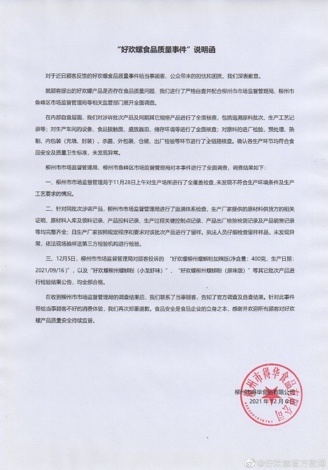12月6日,好欢螺在其微博就“虫卵事件”发布情况说明称,公司内部对涉诉批次产品及同期其它规格产品进行了全面核查,对原料制作的各环节进行了全链路核查,确认各生产环节均符合食品安全及质量卫生标准,未发现异常。柳州市市场监督管理局将6批次样品送检,检验结果均合格。