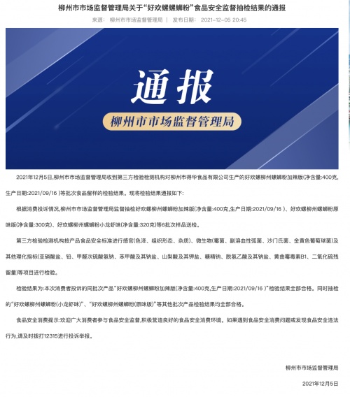 11月30日,柳州市市场监督管理局发布关于“好欢螺螺蛳粉”消费投诉处置情况的通报。经调查,涉诉产品生产厂家柳州市得华食品有限公司持有有效的营业执照、食品生产许可证,目前正常从事食品生产经营活动。执法人员对其生产场所进行了全覆盖检查,暂未发现不符合生产环境条件及生产工艺要求的情况。同时,对同批次涉诉产品进行追溯体系检查,生产厂家提供的原材料供货方的相关证明、原材料入库及领料记录、产品投料记录、生产过程关键控制点记录、产品出厂检验检测记录及产品销售记录等完整齐全,且生产厂家按照规定程序和要求对该批次产品进行了留样。执法人员仔细检查留样样品,未发现异常,依法现场抽样送第三方检验机构进行检验。