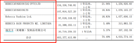 然而,根据公司年报披露按欠款方归集应收账款期末余额前五名的企业名单显示,这五家企业均属于瑞贝卡并表范围。