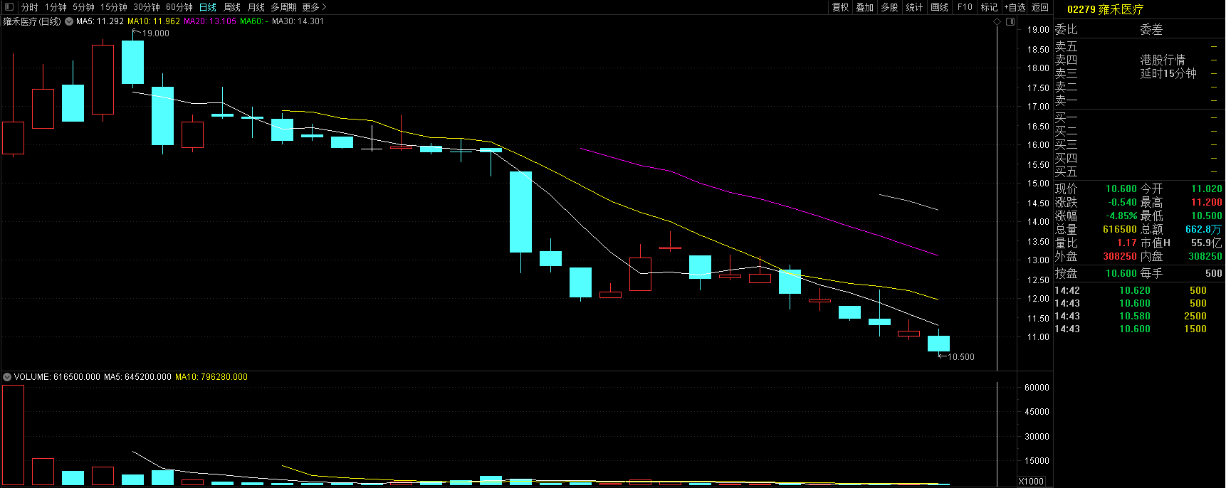 2021年12月13日,“植发第一股”雍禾医疗(02279.HK)在港交所挂牌上市,股价一度上涨到19港元,随后一路下跌。截至2022年1月26日,该股已经跌至10港元左右。。