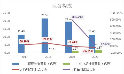 首先,从各业务业绩贡献来看,我们可以看出哈三联主业医药制造营收规模逐年缩水,2019年、2020年均出现了负增长。与此同时,哈三联化妆品行业营收规模却逐年递增,2019年的增长率更是高达806.79%,在2020年营收规模缩减近40%时,仍保持47.42%的增幅,可谓是扭转哈三联业绩颓势的一个重要支撑点。