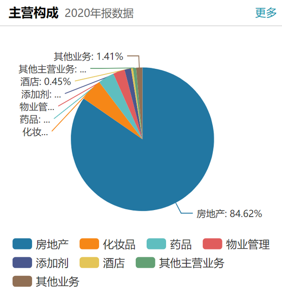 从公司过往业绩表现来看,房地产业务依旧在扛大旗。2021年前三季度,地产业务营收同比下滑26%至43亿元,在总营收中占比67%;化妆品业务营收9.9亿元,同比增长175%,营收占比仅15.7%。