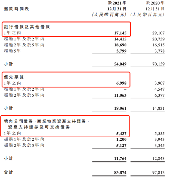而相对应的是,雅居乐一年之内需要归还的银行借款及其他借款为171.5亿元,优先票据为69.98亿元,境内公司债券、商业物业支持债券以及可交换债券等为54.37亿元,合计为295.85亿元。
