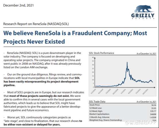去年12月2日,瑞能新能源遭美国做空机构Grizzly Research做空。Grizzly Research直接将瑞能定性为一家“骗子公司”,并称其捏造了大部分太阳能项目。