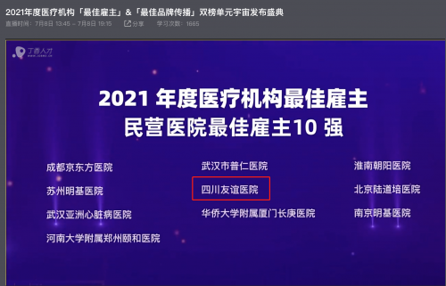 7月8日,由丁香园主办的,2021年度医疗机构最佳雇主&最佳品牌传播榜单发布盛典线上直播举行,盈康一生旗下四川友谊医院上榜“2021年度医疗机构最佳雇主——民营医院10强”。
