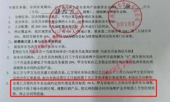 据相关代理商提供给《红周刊》的经销合同显示,如果代理商签约首年未完成约定的年度进货目标的80%,招商公司有权对代理商的合作条件作出调整,包括但不限于缩小经销区域、调整经销产品、按比例扣除合同市场维护金并取消代理商的经销资格,甚至可以终止合同。