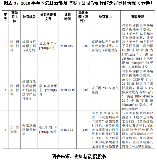 其中,2018年7月,彩虹新能当时的控股子公司江苏彩虹永能新能源有限公司(下称“江苏永能”,2020年被转让)被张家港市环境保护局罚款31万元,处罚事由包括废机油露天堆放、未设置规范的“三防”措施、危险废物未按国家规定进行网上申报登记、生产经营产生的氢氟酸委托无资质单位处置。同年8月,江苏永能因未按规定在购买后 5 日内将所购买的易制爆危险化学品硝酸的流向向公安机关备案,再次受到行政处罚。