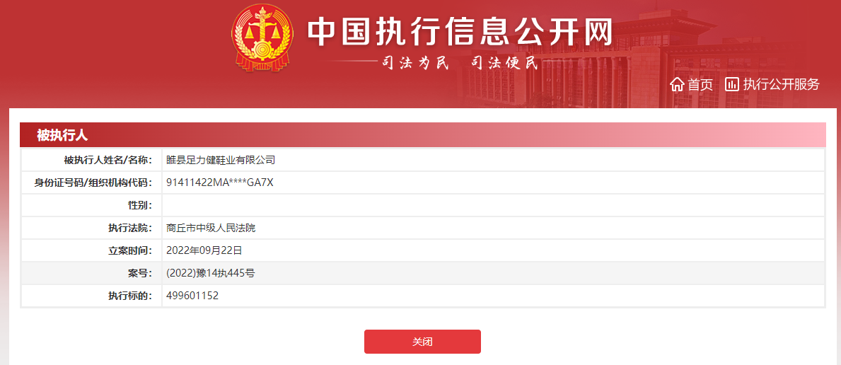 9月27日,据中国执行信息公开网,近日,睢县足力健鞋业有限公司、北京孝夕阳科技发展有限公司及两公司法定代表人张京康新增被执行人信息,执行标的近5亿元,执行法院为商丘市中级人民法院。