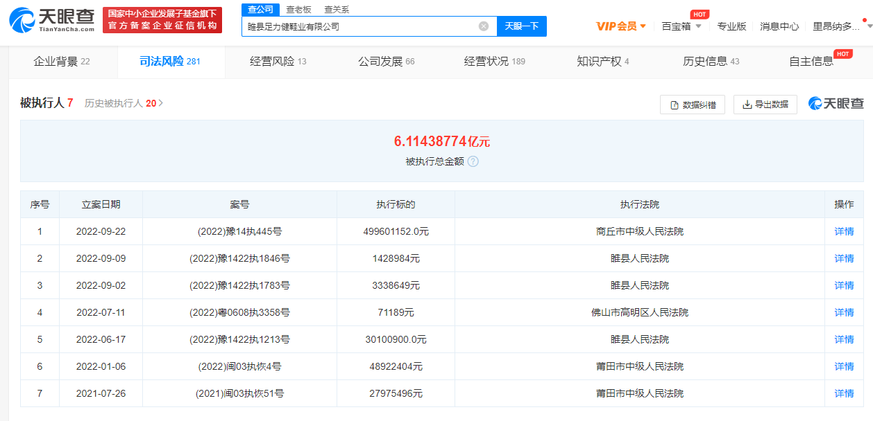 天眼查显示,截至目前,睢县足力健共有7条被执行人信息,被执行总金额超6亿。自2021年7月开始,睢县足力健创始人张京康已多次被限制高消费,涉及福建省本佳自动化科技有限公司申请执行买卖合同纠纷案、汪宗运申请执行买卖合同纠纷案、吉林省东北袜业园织袜有限公司申请执行买卖合同纠纷案、及莆田市伟兴鞋业有限公司申请执行买卖合同纠纷案等。