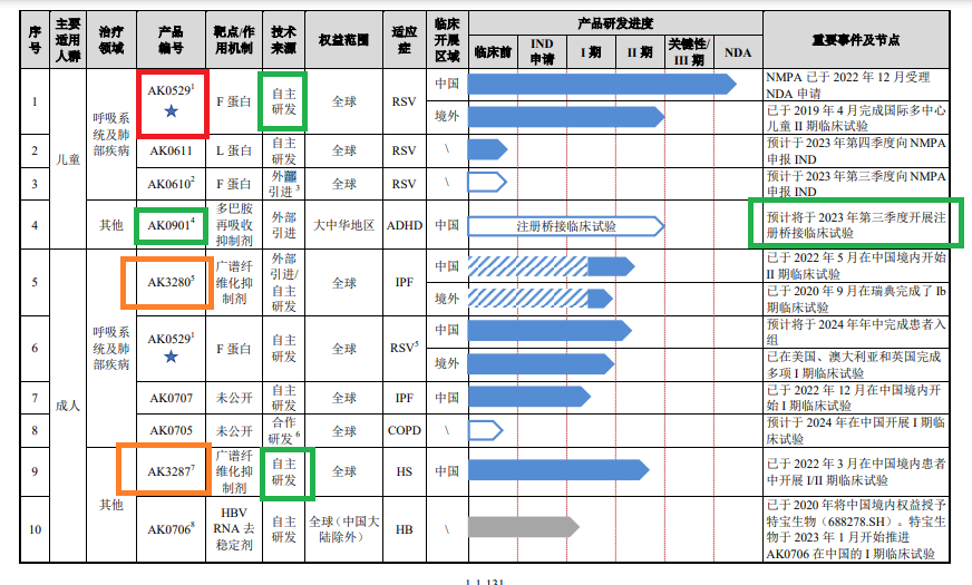 其中,爱科百发的AK0529(抗 RSV 感染)进度最快,NMPA 已于2022年12月受理NDA 申请。但值得关注的是,AK0529产品最早是从罗氏集团引进的,但公司却标注为自主研发。