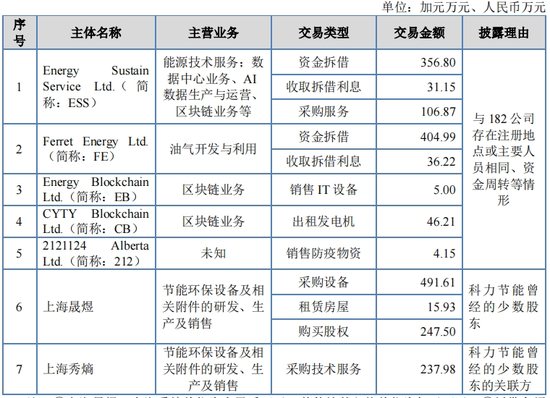 其中,ESS主营业务为能源技术服务,包括数据中心业务、AI数据生产与运营、区块链业务等;FE主要从事油气开发与利用。两家公司均与1822058 ALBERTA LTD(下称“182公司”)存在注册地点或主要人员相同、资金周转等情形,182公司则为公司控股子公司加拿大科力的股东,持股49%。