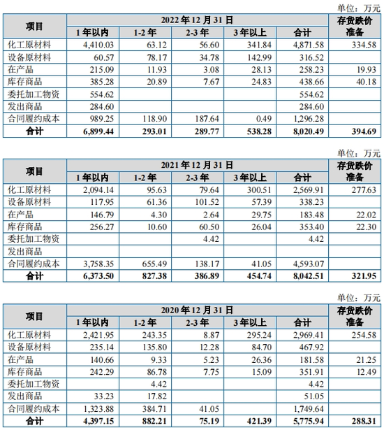 科力股份表示,基于谨慎性原则,公司对存货库龄3年以上(含3年)的化工原材料、在产品、库存商品及发出商品,全额计提存货跌价准备。但实际上,报告期各期末,公司存货跌价准备余额分别只有288.31万元、321.95万元、394.69万元和516.88万元,低于存货库龄3年以上存货金额。