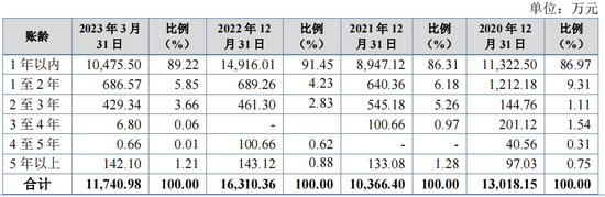 报告期各期末,科力股份应收账款余额分别为1.3亿元、1.04元、1.63亿元及1.17亿元,2020年-2022年,公司应收账款余额占营业收入的比例分别为41.7%、30.98%、36.51%。各期公司应收账款账面价值占同期流动资产的比例分别为41.29%、30.55%、47%、36.57%。