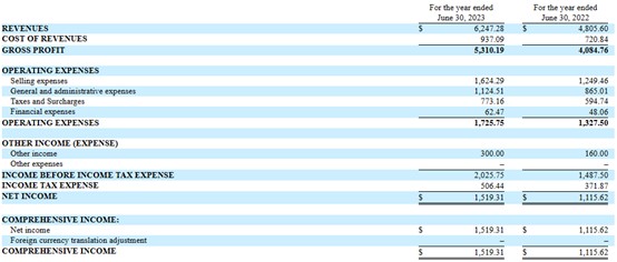 从财务方面来看,其所披露的财务报表,均为未经审计的报告。在过去的2022财年、2023财年(财政年结日为6月30日),后羿国际的营业收入分别为480.06万、624.73万美元,相应的净利润分别为111.56万、151.93万美元。