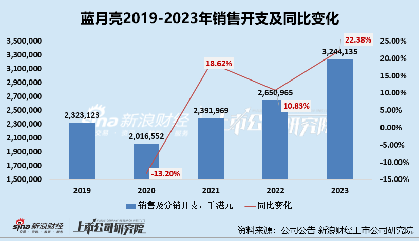 销售额增长可观的情况下,亏损却大幅扩大三倍左右,问题的关键在于营销开支的增加。正如公司业绩预警中所提及的那般,2024年上半年销售额的增加被销售活动增加导致的销售及分销开支增加所抵消,尤其是由于推广新产品、拓展新电商渠道及品牌建设的业务。以下,我们来看一下,蓝月亮在营销端的开支状况。