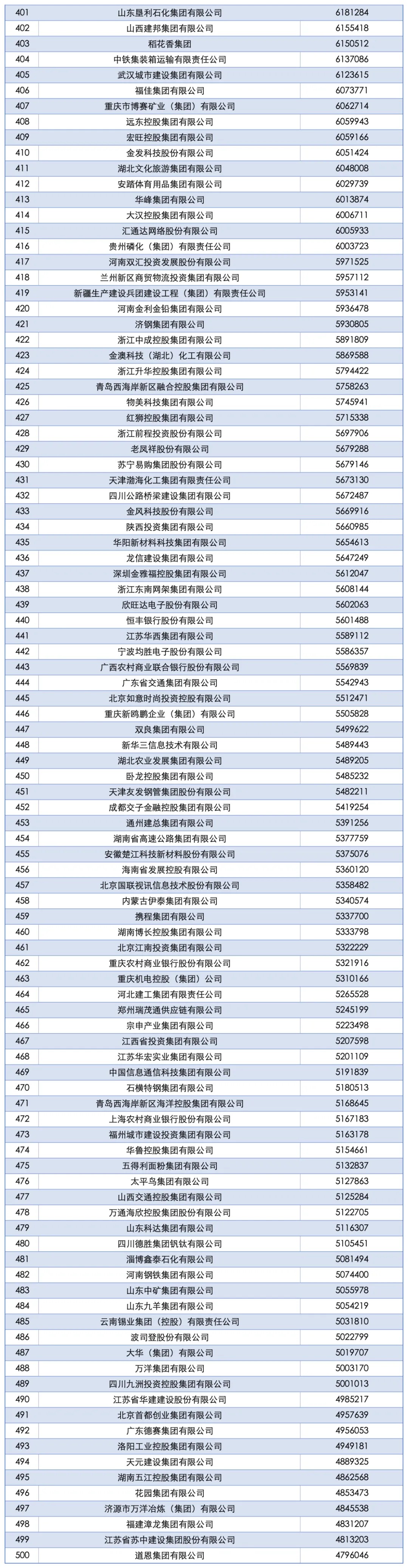 9月15日,中国企业联合会、中国企业家协会发布了“2025年中国企业500强排行榜”。2025年中国企业500强总营业收入达110.15万亿元,入围门槛实现23连升,达479.60亿元,提升5.79亿元;实现归属母公司所有者净利润总额4.71万亿元,增长4.39%。其中,营收超过1000亿元的企业数量为267家,较上年增加14家,千亿元级企业占比达53.4%。国企、民企入围企业数量保持基本均衡格局,分别为251家、249家。