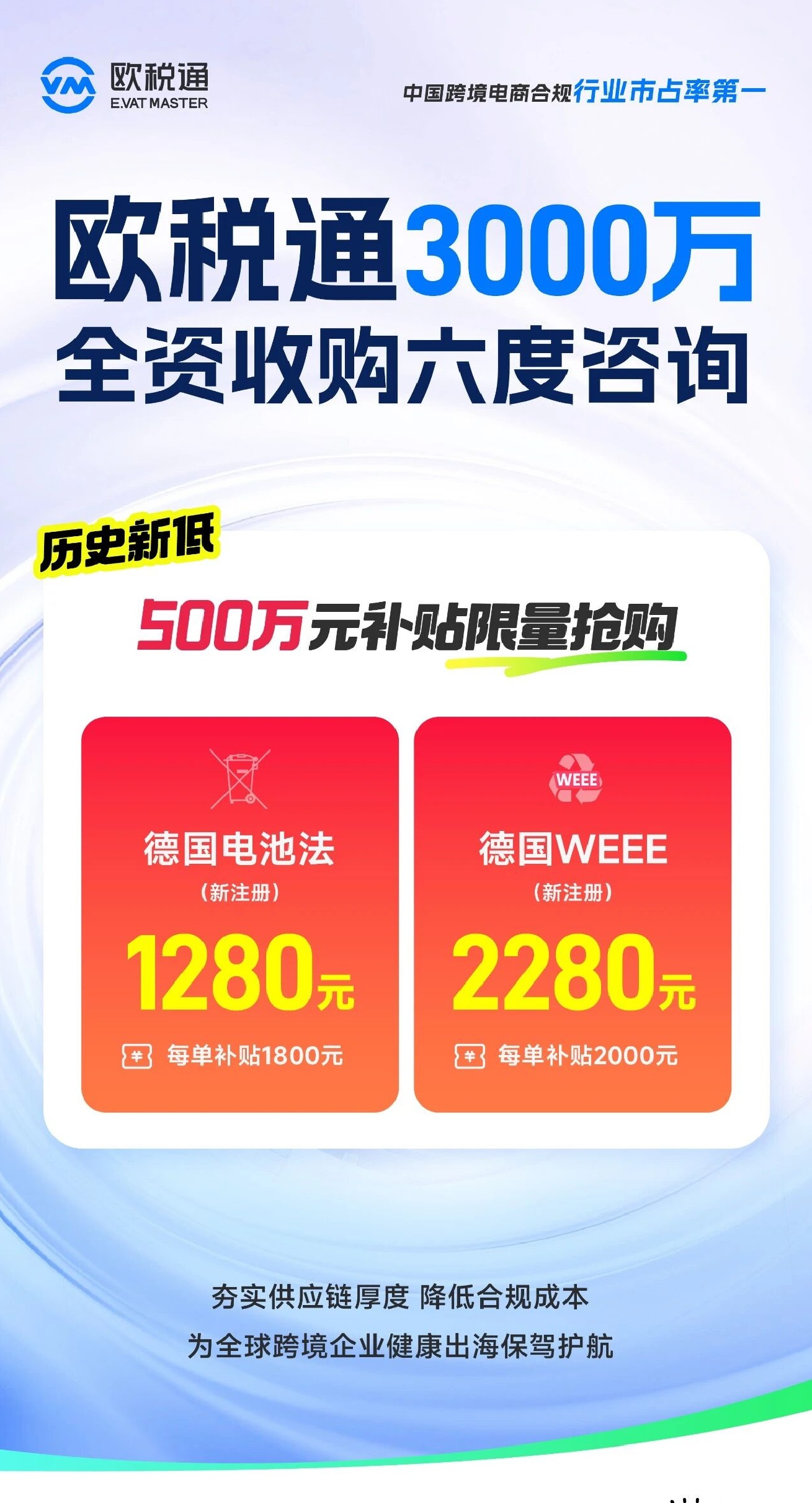 六度咨询拥有强劲的供应链实力,在跨境电商合规领域具备高度稀缺资产属性,具备对接官方监管系统并履行法定义务的主体资格,拥有德国 WEEE、德国电池法超高配额!除直接服务跨境电商卖家外,六度咨询长期深耕合规代理服务,为多家行业服务商及亚马逊、美客多等平台提供底层合规支持,目前代理服务数量位居行业前列。本次收购完成后,六度的核心资质、代理网络及本土交付能力将整体并入欧税通合规体系,进一步强化欧税通供应链的纵深布局与规模化的交付能力!