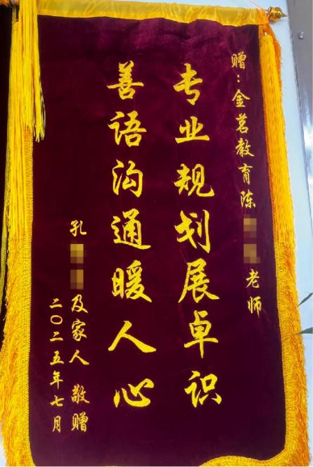 高考出分后,陈老师结合孔同学的家庭情况和兴趣爱好,为他制定出兼顾“好城市、好学校、好专业”的志愿方案。最终孔同学以654分成功被东南大学电子信息类专业录取,一分不浪费。这份圆满,也让孔同学一家特意送来锦旗致谢。