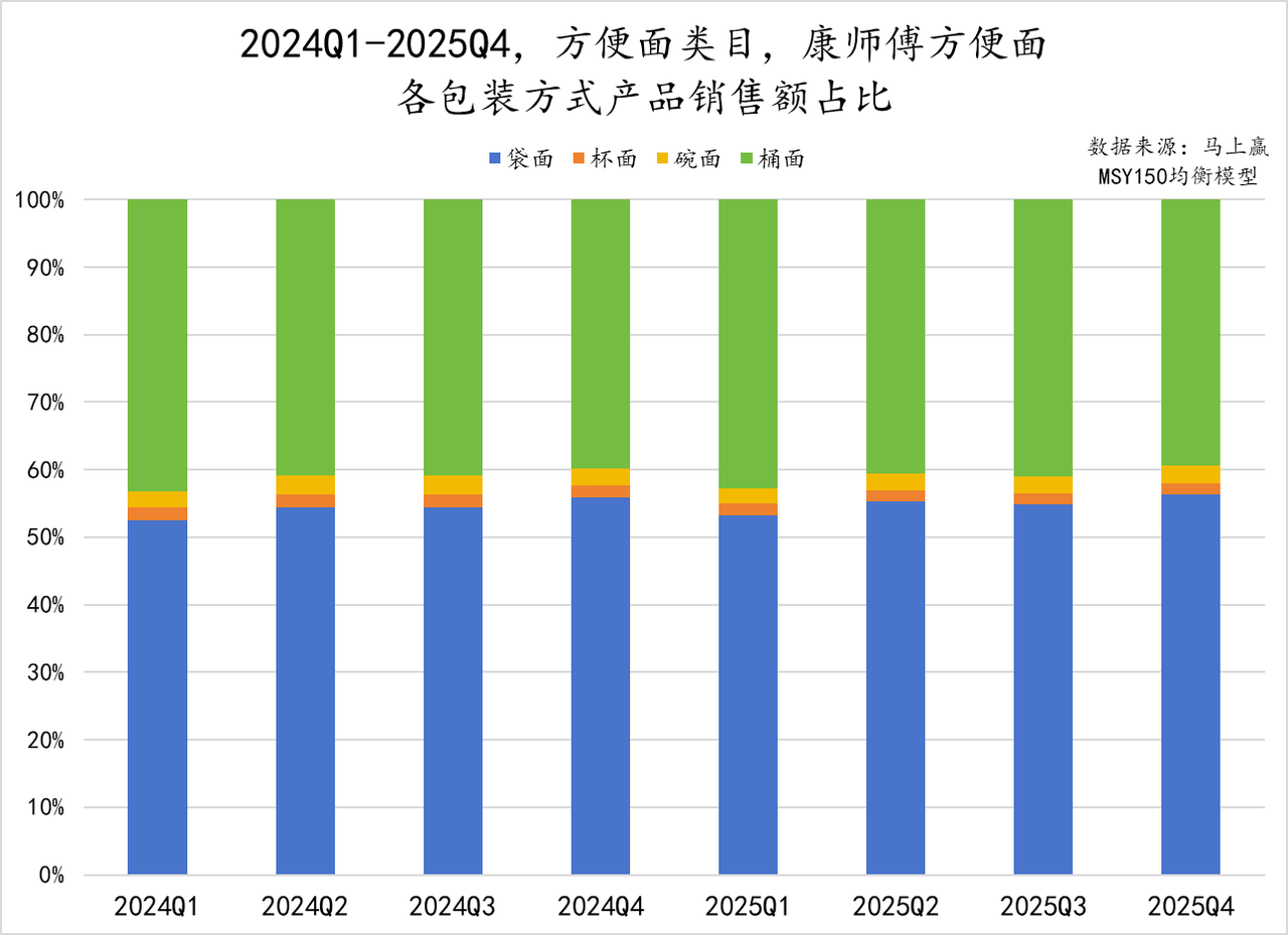 从包装方式的变化上看,虽然袋面、桶面二者依旧是家内、家外场景中最常选择的包装类型。但随着用餐场景的拓展,杯面、碗面等适应不同消费人群、消费习惯的产品也占据了一定规模,且在2024年至2025年呈上升趋势。