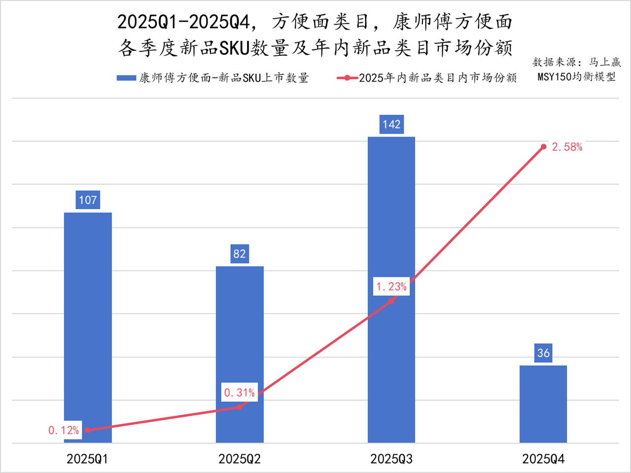 从康师傅年内新品的市场份额走势来看,2025年内新品的市场份额逐季递增,且涨势加速,意味着新品上市后的成长速度越来越快。四季度,康师傅全年新品在方便面类目中的市场份额已超过2.5%,甚至与一个小品牌在速食市场上整体份额不相上下,真正做到让新品真正在市场中找准位置站住脚。