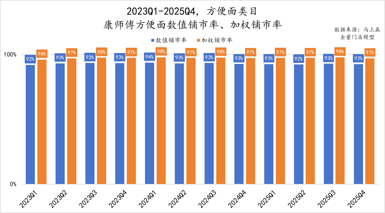 线下零售的重要指标中,数值铺市率反映的是渠道覆盖的“广度”即有多少家店在卖康师傅方便面——2023年至2025年,康师傅铺市率始终稳定在92%以上。“有方便面就有康师傅”,在数据面前似乎成了事实。